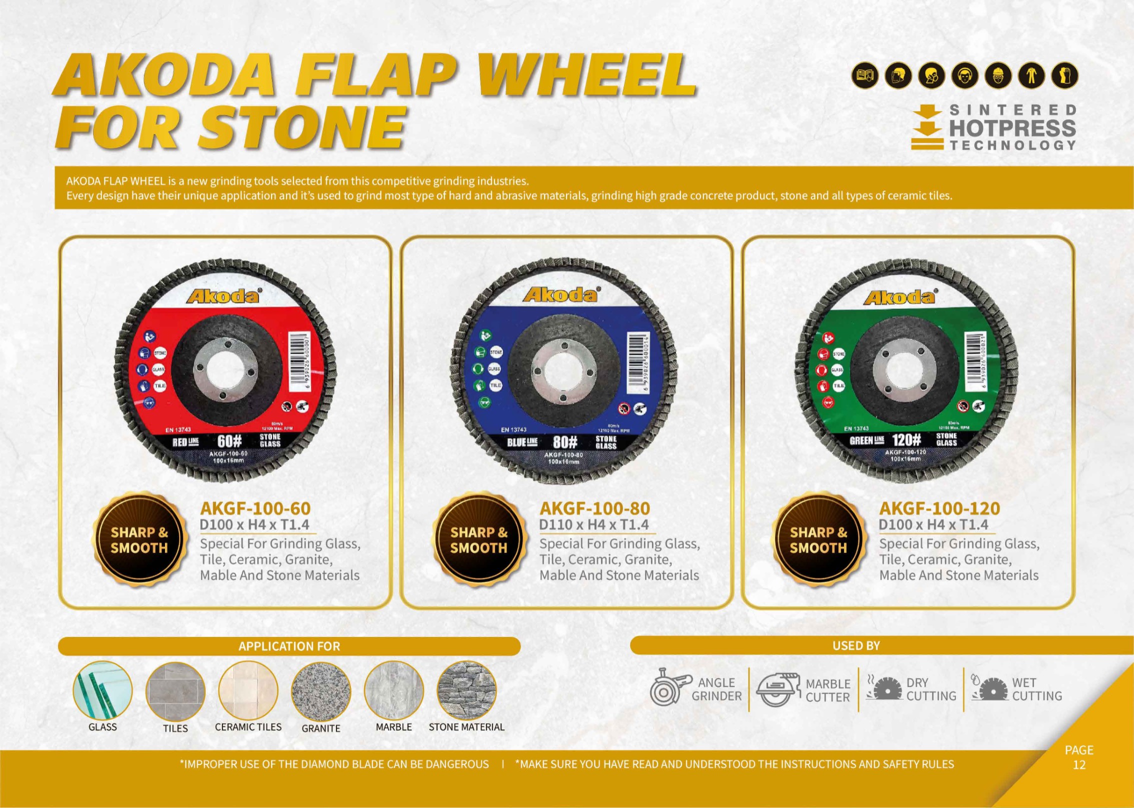 AKODA FLAP WHEEL is a new grinding tools selected from this competitive grinding industries. Every design have their unique application and it's used to grind most type of hard and abrasive materials, grinding high grade concrete product, stone and all types of ceramic tiles.