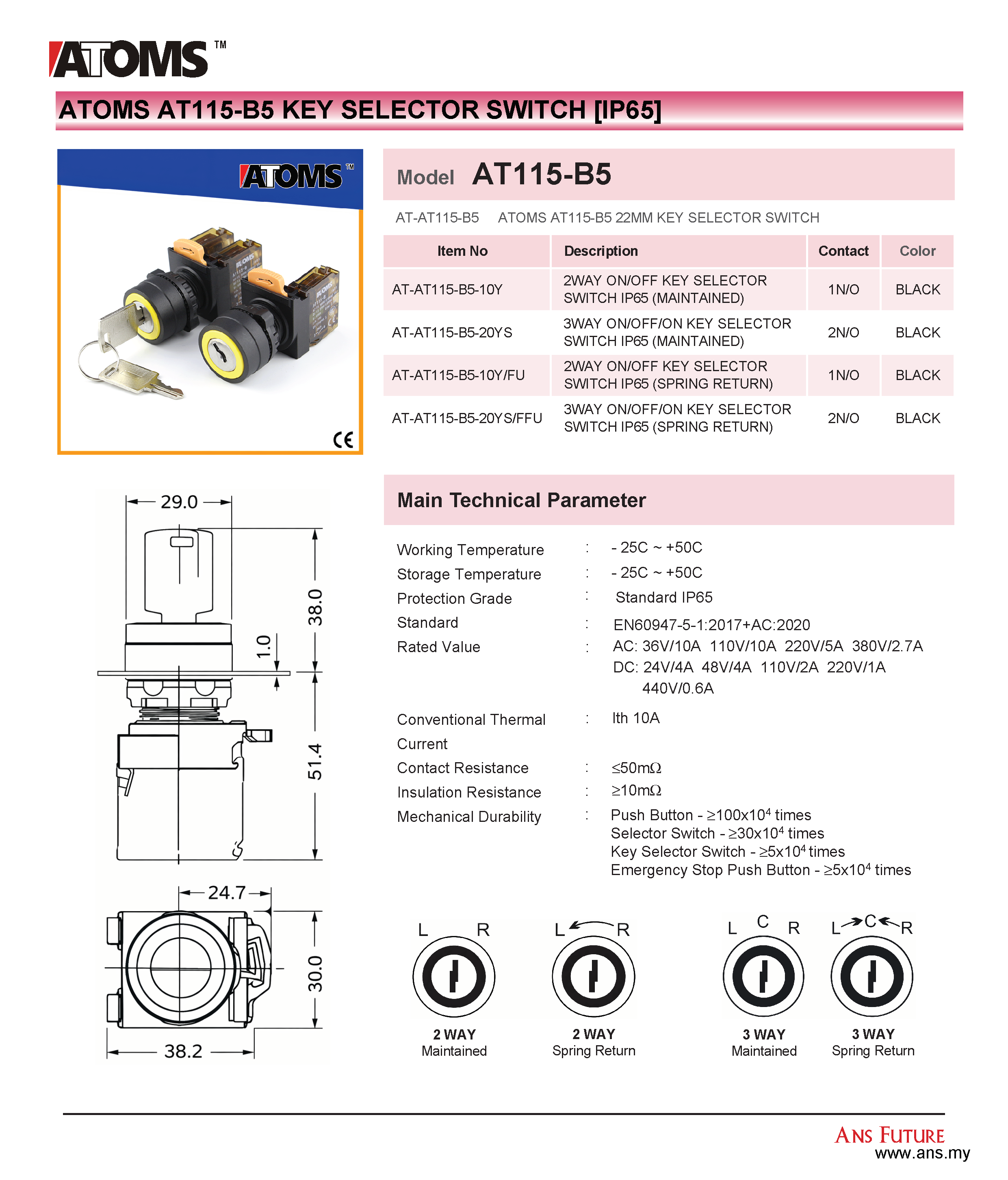 ATOMS AT115-B5 Key Selector Switch (IP65)