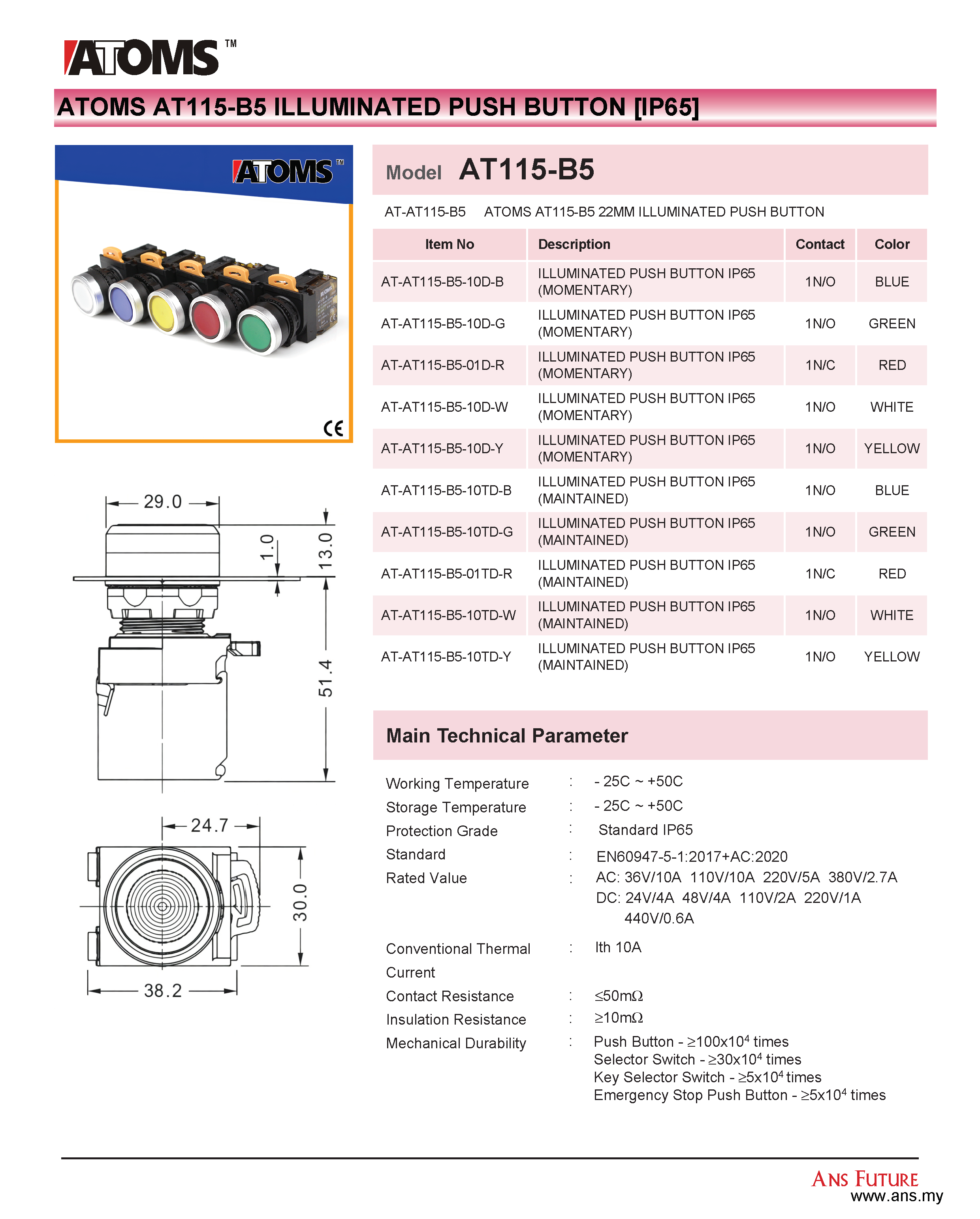 ATOMS AT115-B5 Illuminated Push Button (IP65)