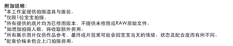 百日是宝宝生命中第一个重要纪念日,象征平安健康与成长喜悦。 通过专业摄影,将宝宝最纯真、最可爱的模样定格下来, 留下珍贵影像,让这份珍藏陪伴宝宝一生。