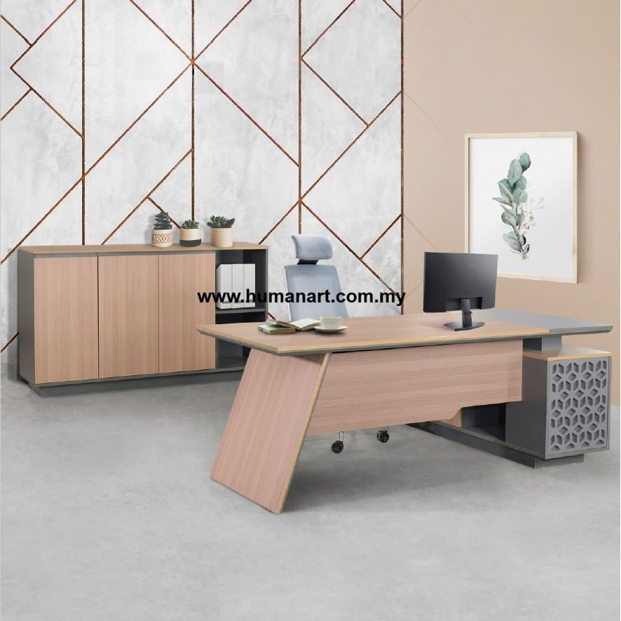 | MODEL : RBC21 | MEJA PEJABAT PENGARAH EKSEKUTIF DENGAN KABINET TEPI | WARNA : CAFE LATTE + DARK GREY | SAIZ : | 2100W x 1800D x 750H mm |